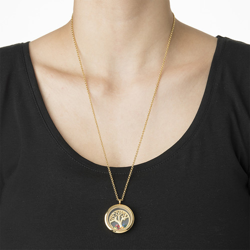Include everyone in your inner circle with our unique Family Tree Floating Locket. Add a birthstone for each special person to float in your locket around the meaningful Tree of Life charm. This stainless steel locket and its chain are gold plated and sure to sparkle and shine through everyday wear. This item is also offered in Silver.