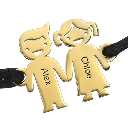 No other gift out there says "I love you" to a mom than our Kids Holding Hands Charms Bracelet - Gold Plated. This charms bracelet features two kids holding hands, making it the best in mom jewelry. Get any names you would like engraved on this bracelet. And with a satin cord, it ensures a super comfortable fit whenever you wear it!The kids charms bracelet is made out of 18k Gold Plating over 0.925 Sterling Silver and hangs on a Black Cord Bracelet.