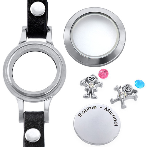 Our Floating Locket Necklace is now available as a Floating Locket Bracelet! Personalize this pretty piece for Mom or Grandma with adorable children charms and birthstones The silver disc can be engraved with up to two names. The locket pendant is made of stainless steel affixed on a leather wrap bracelet. This item also available in Stainless steel chain.