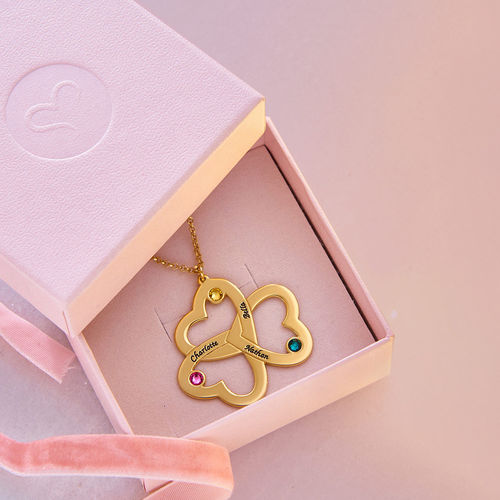 Moms and grandmas everywhere love the look of our Personalized Triple Heart Necklace in Gold Plating! This beautiful, sophisticated piece features three intertwined hearts.Choose up to three names or meaningful words to engrave on the pendant, and select a coordinating birthstone for each one. The sky really is the limit, giving this necklace incredible potential for commemorating sisters, friends, and so much more.